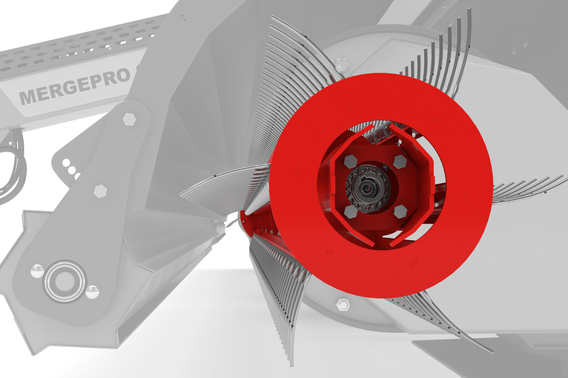 Camless 6 row pickup reel means, no unnecessary bearings, control rollers, curved tracks and tine carrier profiles. Significantly fewer components for higher working speed and reduced maintenance. Simple rotation, no additional moving parts, no additional wear. Less parts = less maintenance.